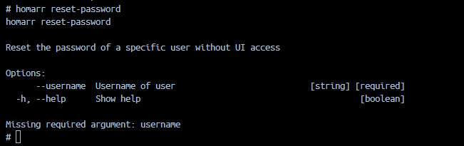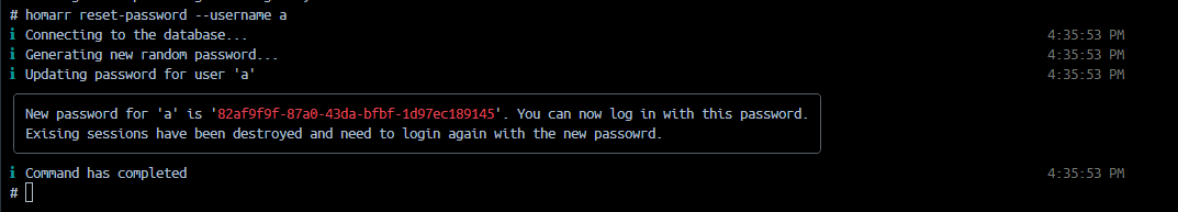 Using the --username parameter, you can specify who you want to reset the password for. Executing the command will create a new random password, update the database and display the new password. All sessions for this user will be terminated and they must re-login.